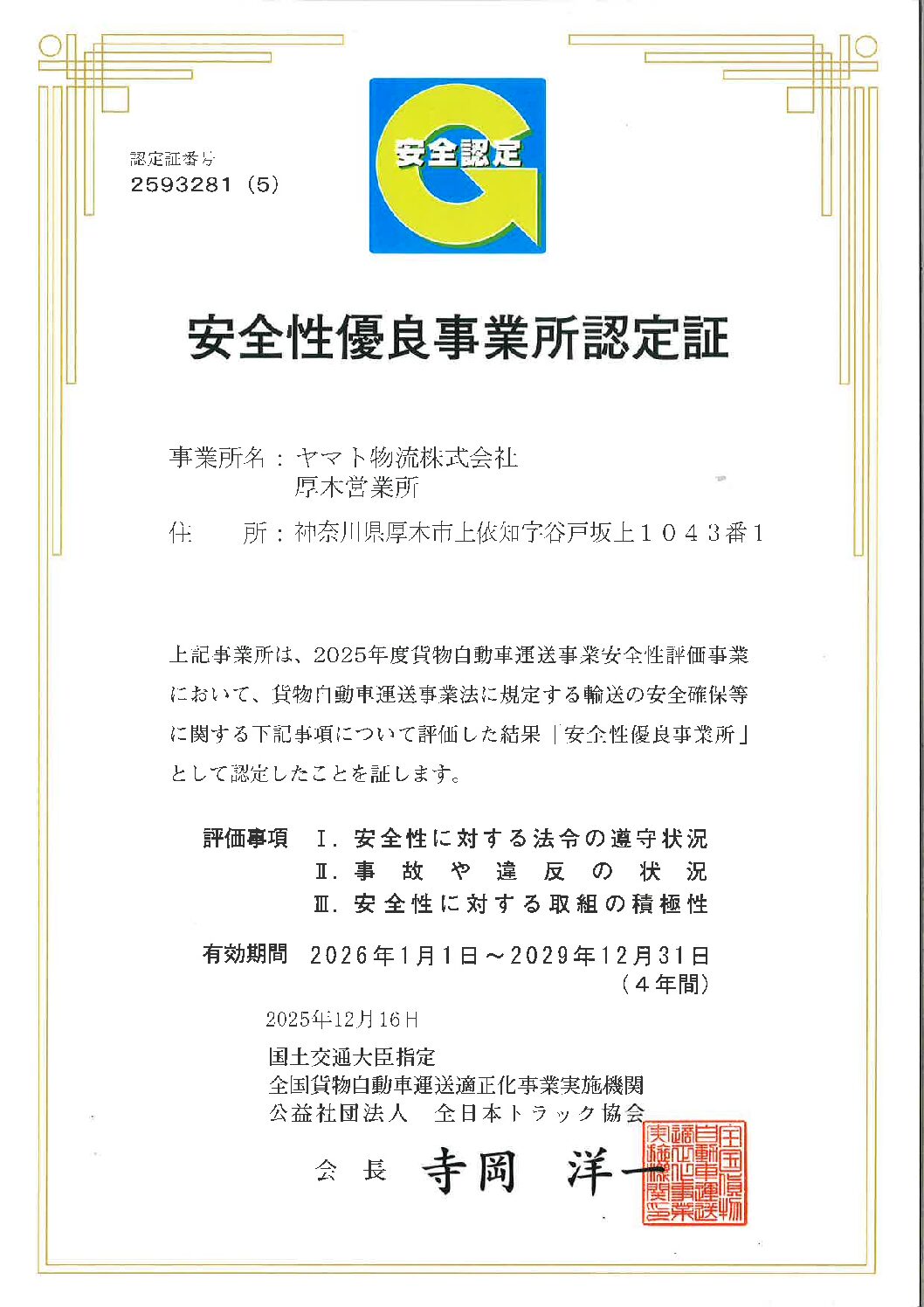 厚木営業所におけるGマーク取得のお知らせ